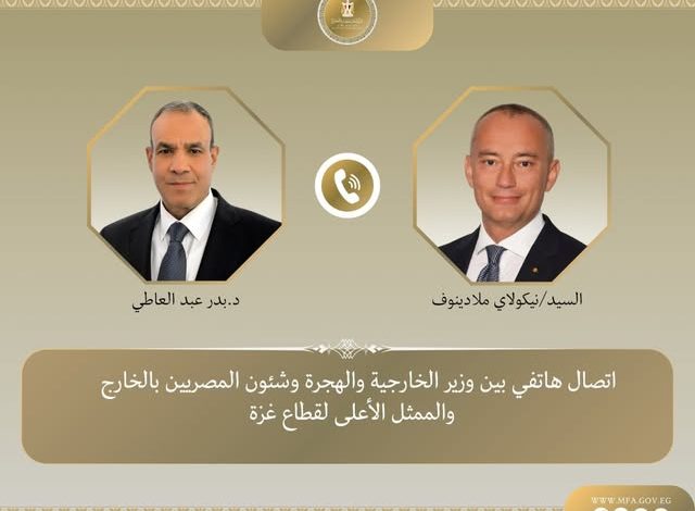 أجرى د. بدر عبد العاطي، وزير الخارجية والهجرة وشئون المصريين بالخارج، اتصالًا هاتفيًا مع السيد نيكولاي ملادينوف، الممثل الأعلى لقطاع غزة، تناول خلاله آخر مستجدات الأوضاع في القطاع وجهود تنفيذ المرحلة الثانية من خطة الرئيس الأمريكي للسلام.